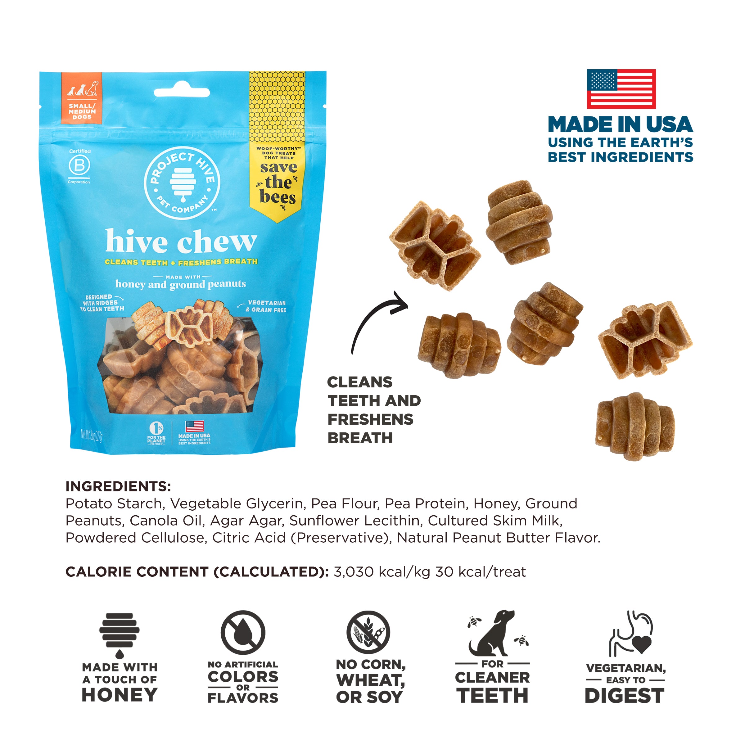 Hive Chews for small to medium size dogs are delectably crunchy treats with an irresistible peanut taste. Made in the USA with wholesome ingredients, our treats are Non-GMO Project Verified, vegetarian, and made with organic honey for a touch of sweetness from our worker bee friends. They are easy to digest, help freshen a dog’s breath and clean their teeth. And you know what else? Your purchase helps save the bees!