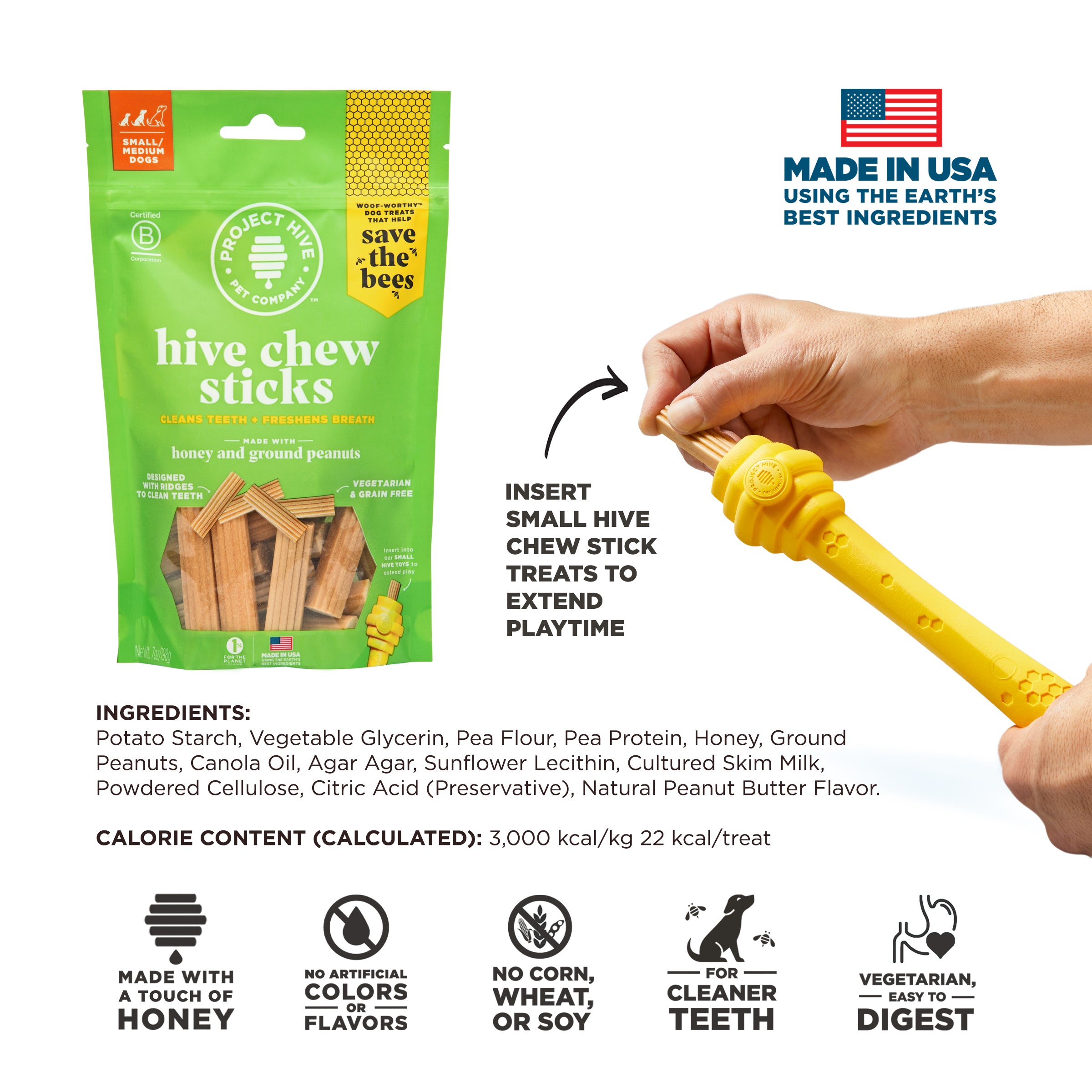 Hive Chew Sticks are delectably crunchy treats with a peanut taste that dogs can’t resist. Made in the USA with wholesome ingredients, our easy-to-digest treats are Non-GMO Project Verified, vegetarian, and made with organic honey for a touch of sweetness from our worker bee friends. And as an added bonus, they also help clean your dog’s teeth and freshen their doggie breath.